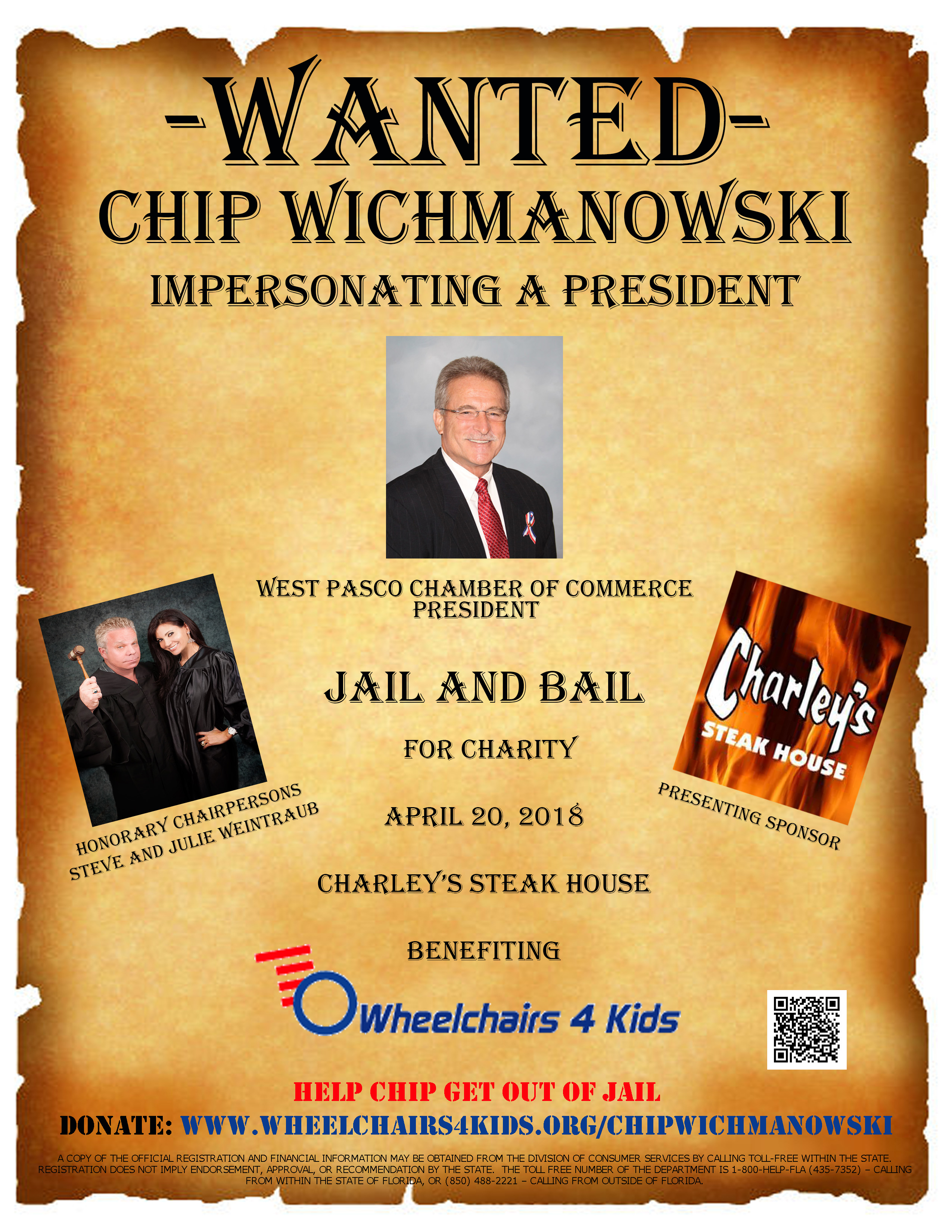 Crime: Impersonating a PresidentChip Wichmanowski aka “Chipster” has been charged with Impersonating a President! He is planning on building a wall around Pasco and making Pinellas County pay for it! The people of Pasco are against this because a lot of them work in Pinellas County but he vetoed the votes! Chipster has been known to take Air Pasco 1 to Clearwater Beach for his own pleasure and the citizens have had enough! Chip served as President of the West Pasco Chamber of Commerce since January 2, 2013. Previous positions include Executive Director for the Pasco Education Foundation, Director of Communications for the District School Board of Pasco County, Principal, Teacher and Coach! This Summer he will be retiring and will be able to spend more time with his wife of 40 years, Debbie, their 3 kids Nick (Amanda), Jamie Marie and Ali, as well as his 2 grand kids Drew and Ava! Please make a donation today to help Chip get out of jail. Ask your friends to donate too. Who knows, maybe they can become an accomplice?! Every donation will make a difference in a special child’s life! |