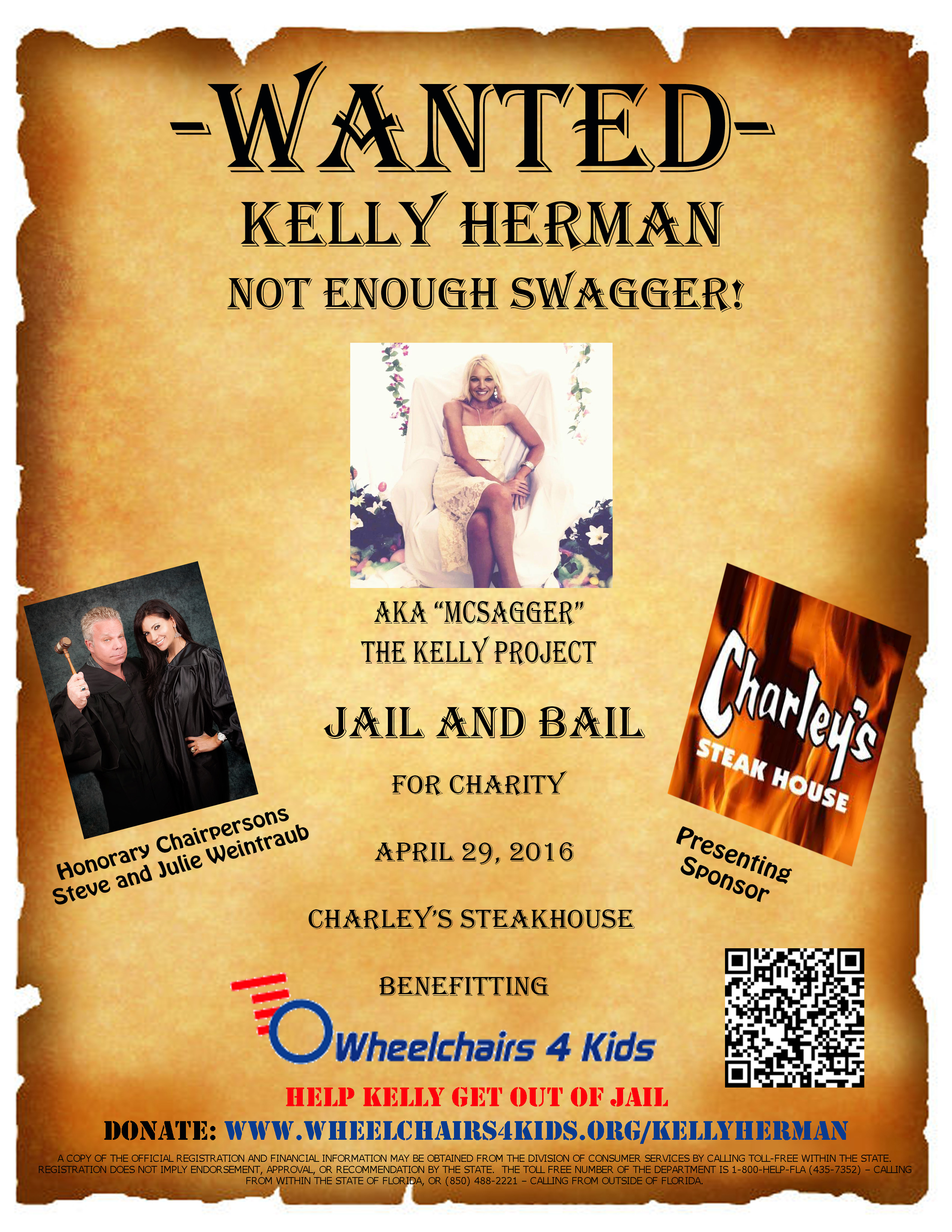 Bail: $3000.00AKA – “McSagger”Crime: Not having enough Swagger! Kelly Herman aka “McSagger” has been seen DANCING in public! She has NO dance moves. Kelly feels her dance “moves” are cool. They’re a complete assault to innocent people’s eyeballs! She must be stopped since she has NO “Moves like Swagger”. Kelly is a mom of two wonderful girls. She lives in Trinity area of Pasco County. Kelly spends her time helping others in the Tampa Bay Area, since giving back is truly her life’s work. Let’s free Kelly! She needs your help! Every donation will help a child in need! Please make a donation today to help Kelly get out of jail. Ask your friends to donate too. Who knows, maybe they can become an accomplice?! Every donation will make a difference in a special child’s life! |
