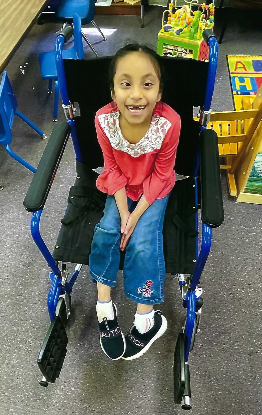 Maria needs a manual wheelchair to improve her independence. Currently, she is using an adult-sized chair from school that is too big and uncomfortable. Her wonderful teachers are even willing to take a day off to pick up her new chair. Please be her sponsor!