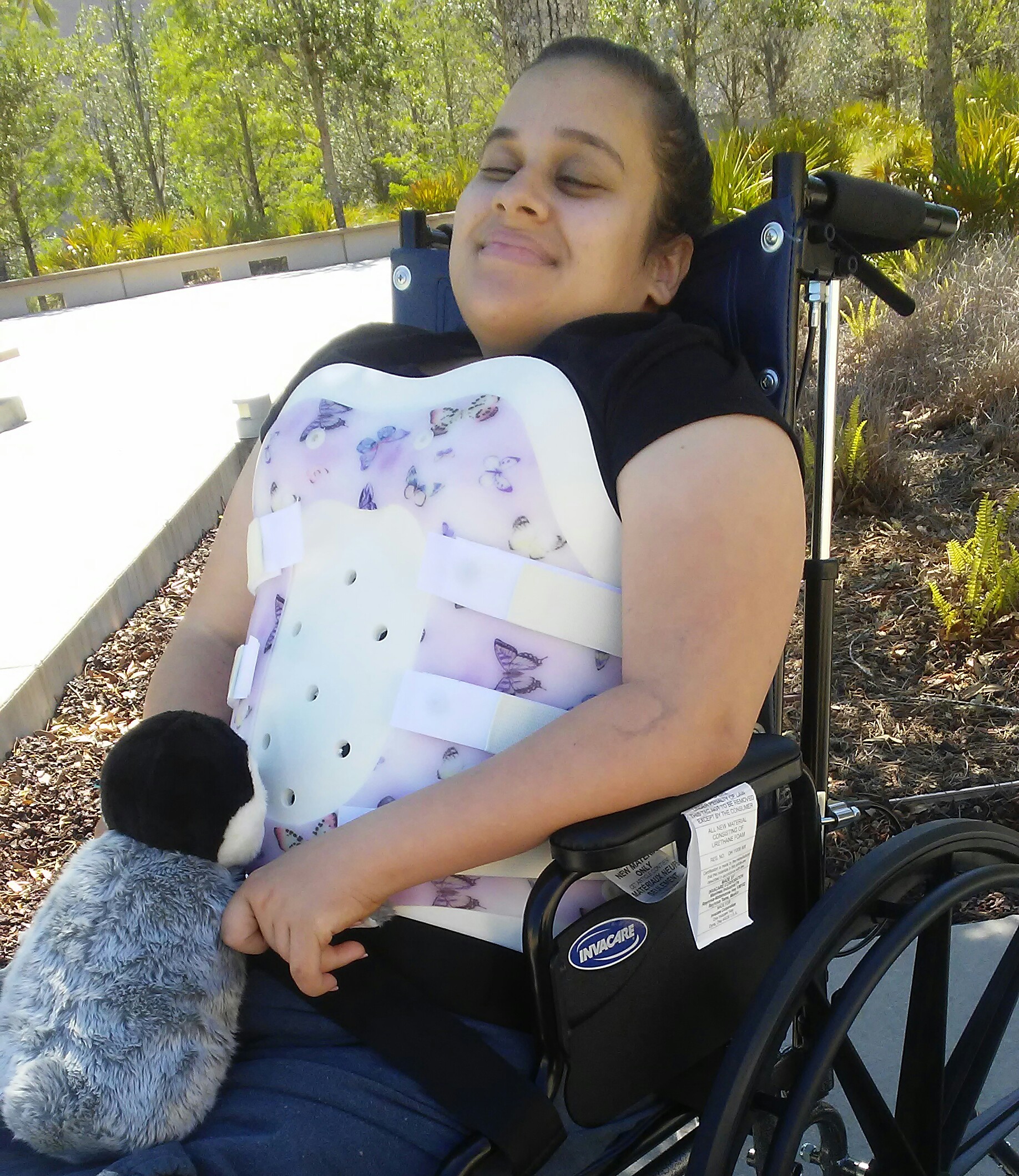 Meet 16-year-old Crystal, who was diagnosed with Arthrogryposis and scoliosis. She is not able to walk; a power wheelchair helps her to move around the house. Crystal also endured back surgery. She wears a brace since the procedure to protect her back during transfers. These obstacles do not frustrate a strong-willed young lady.