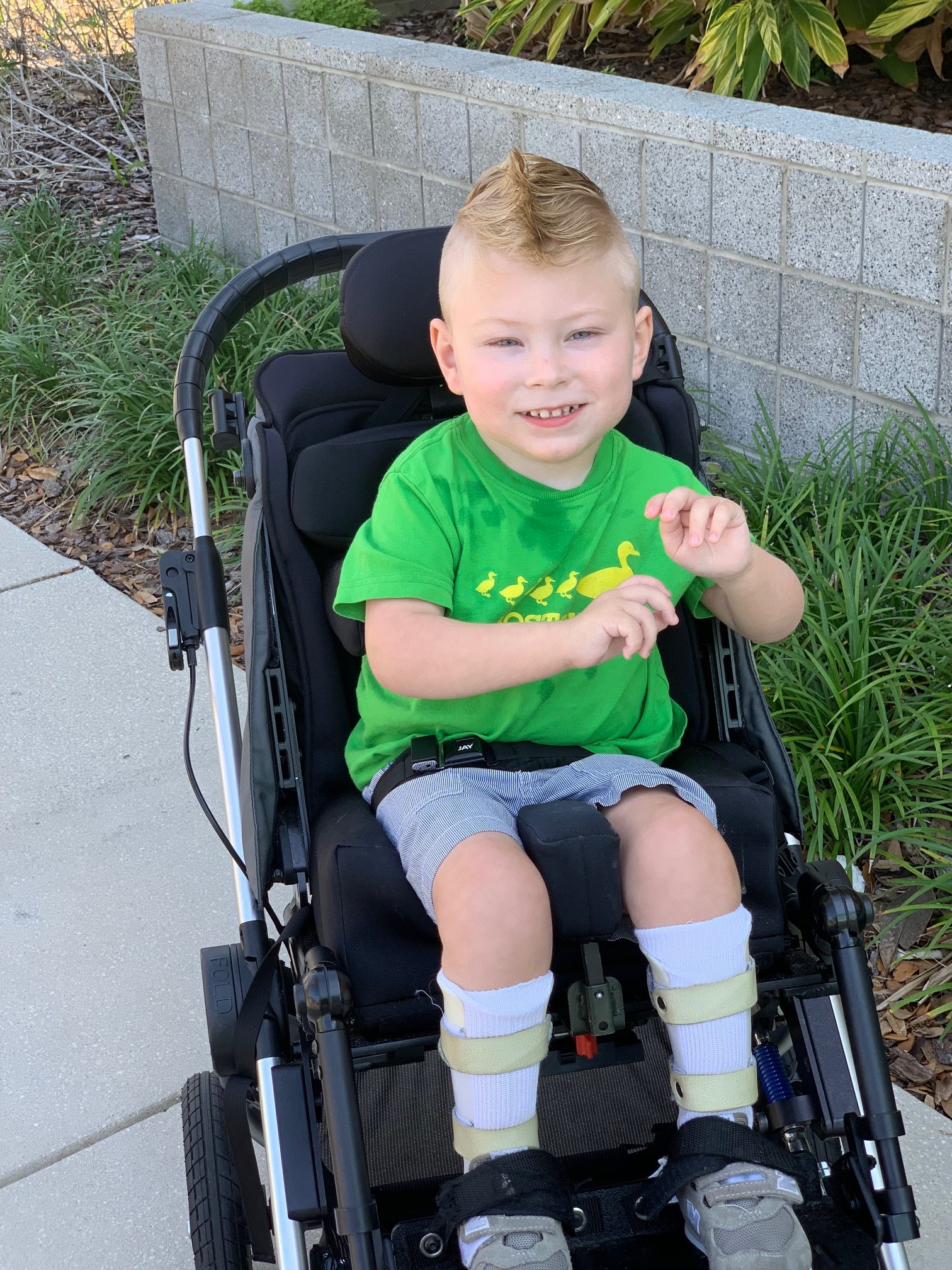 Hudson is determined to have fun regardless of his obstacles. He watches his favorite tv show, The wiggles. He listens and dances to upbeat salsa music. Hudson also enjoys being outside on his stander and playing kickball. Most of all, Hudson loves people and being social. His favorite is being in school with his friends or going to the zoo to observe everybody having a great time. Hudson is a remarkable boy. He feels joy in the happiness of strangers.