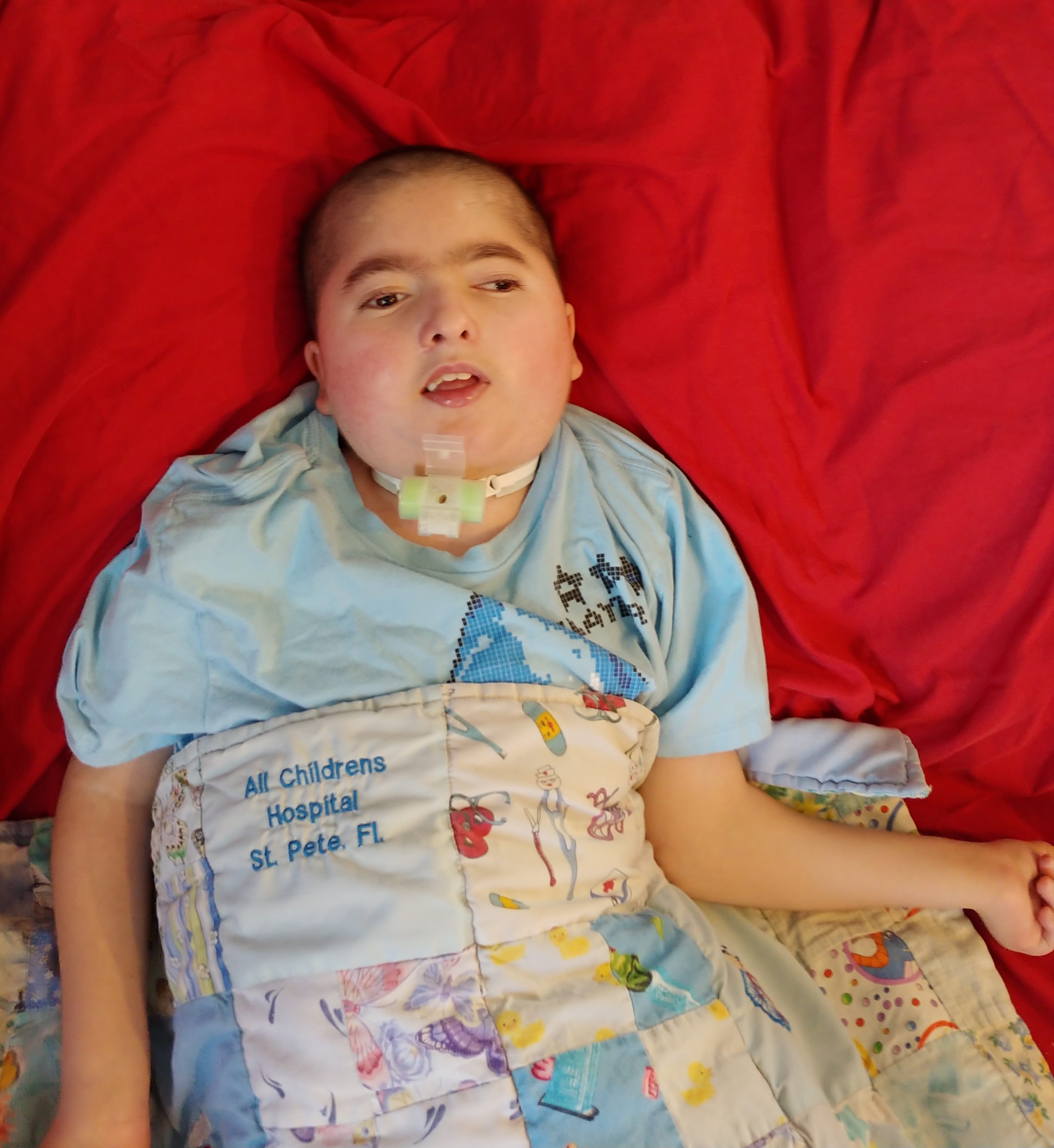 Meet 12-year-old Alex. He was a healthy and carefree child for several years. Unfortunately, eight years ago a near drowning left him oxygen deprived and brain damaged. He spent nearly a year at All Children’s Hospital. He survived the ordeal, but not without consequences. Currently, Alex is nonverbal, although he understands questions and can blink yes or no. Alex reveals his adorable side when he responds by smiling or sticking out his tongue. He is also dependent on his family for daily living skills. He uses a hyperbolic chamber every evening to increase his oxygen intake and improve his health. Alex necessarily takes over a dozen different medications and as a result he is often sleeping. Alex remains a fighter with a happy heart.
