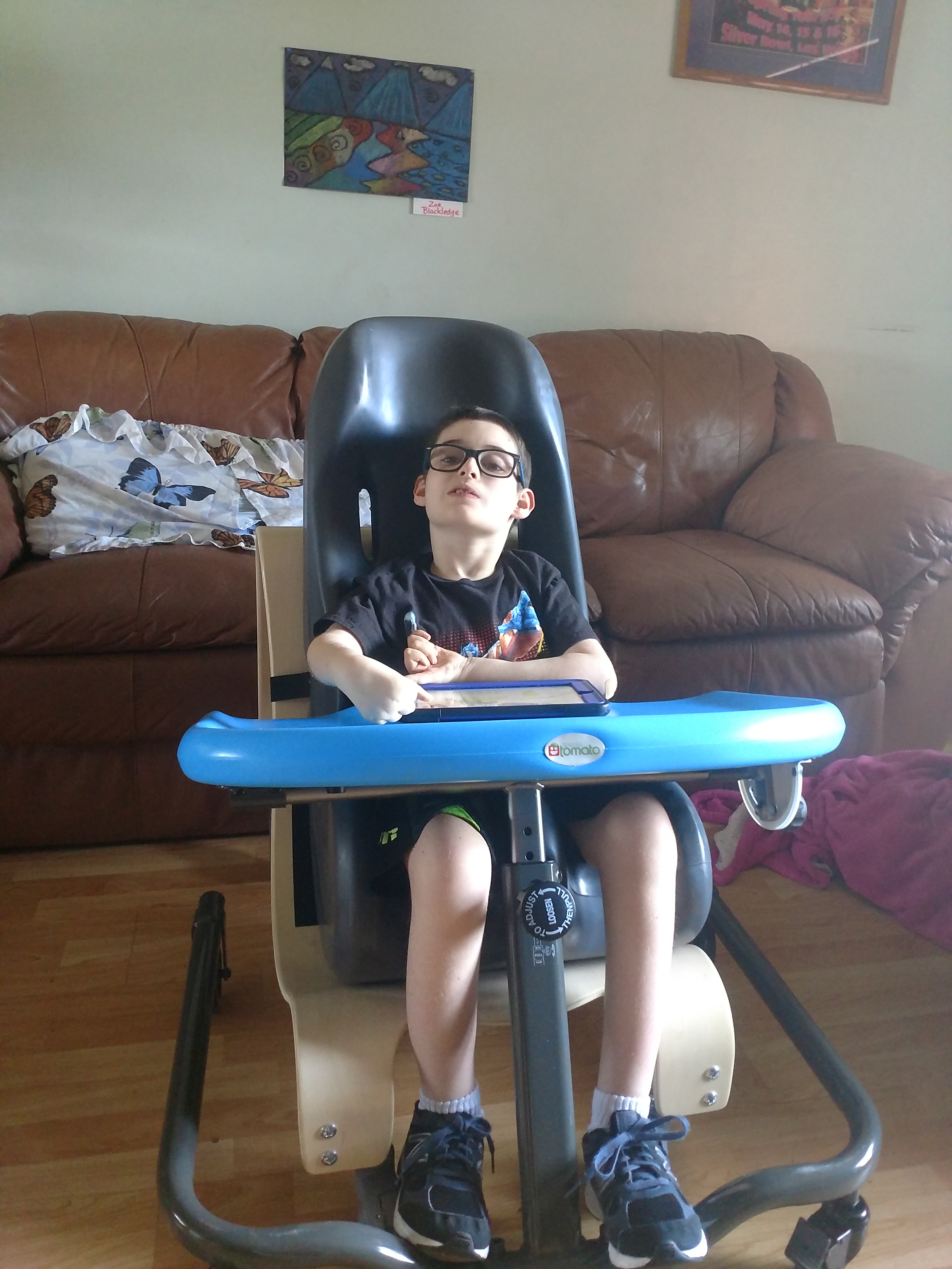 Hunter received his Special Tomato seat and activity tray. This special seat provides Hunter with a safe and comfortable alternative to his wheelchair when at home. The activity tray gives him the opportunity to use the seat for various activities like watching videos on his tabloet, making puzzles and even enjoying a snack!