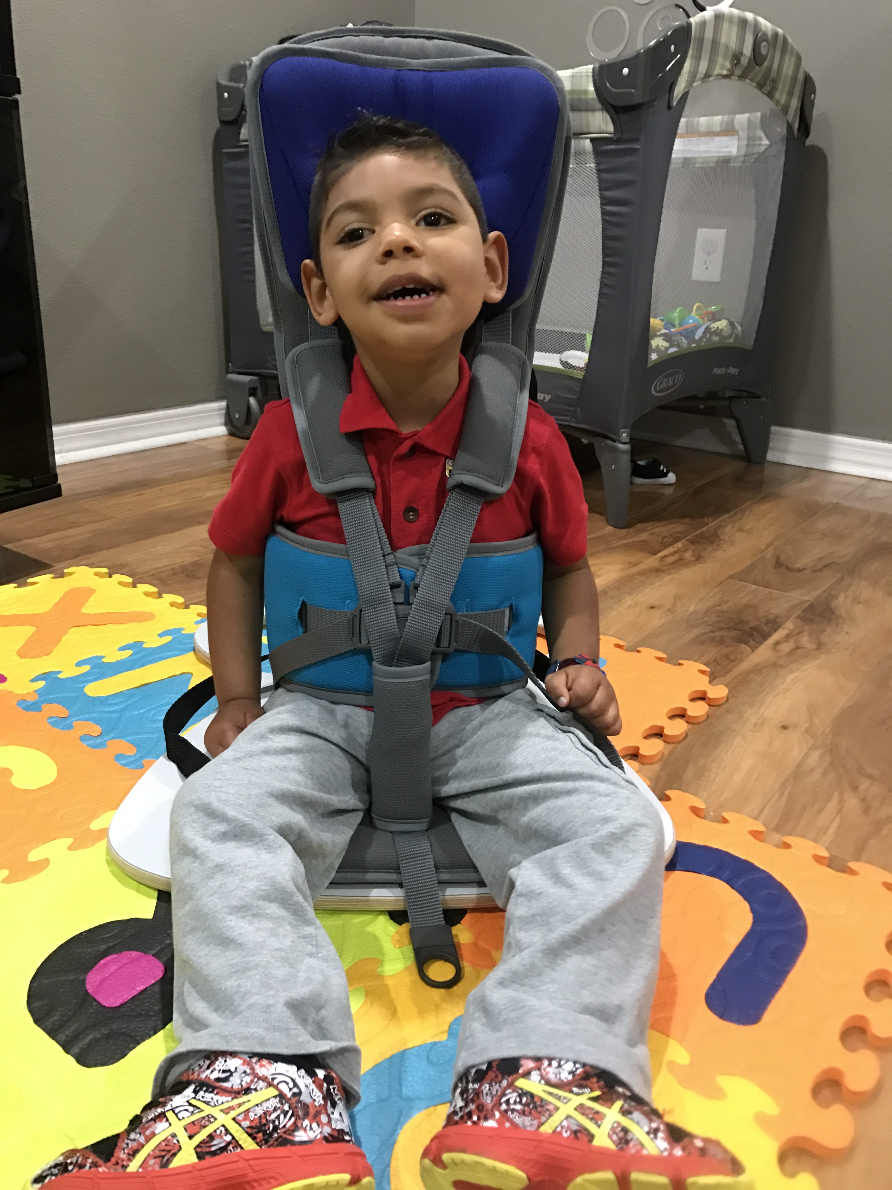 Fabian has his new Go-To-Seat. He is now able to sit comfortably and safely just about anywhere! He can be on the floor playing or at the table enjoying family diner time while being upright with great trunk support!