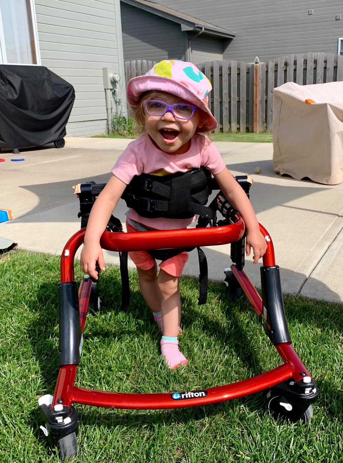 Meet two-year-old Naiya. She was diagnosed with Hypoxic Ischemic Encephalopathy, a type of brain damage occurring after blood and oxygen deprivation. Months later she was diagnosed with quadriplegic cerebral palsy. She is nonverbal. Naiya also uses a gait trainer to walk. Naiya is happy even during her difficult circumstances.